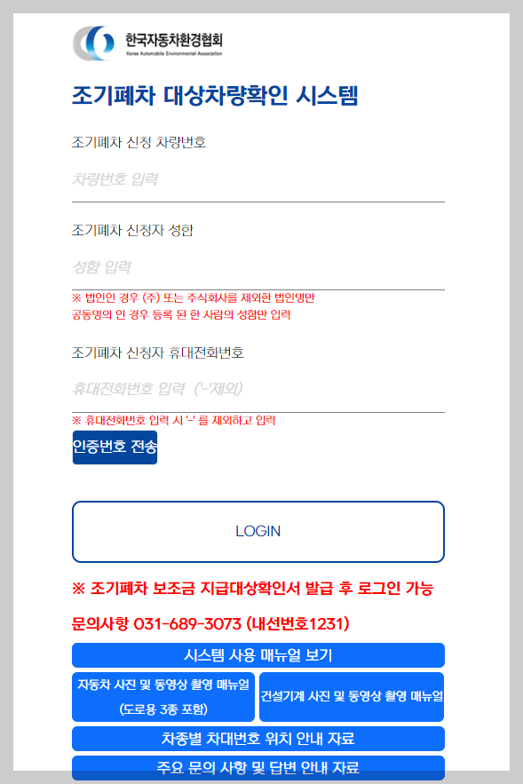 - 우편주소 : (14055) 경기도 안양시 동안구 시민대로 317, 대한스마트타워 6층 한국자동차환경협회 조기폐차팀