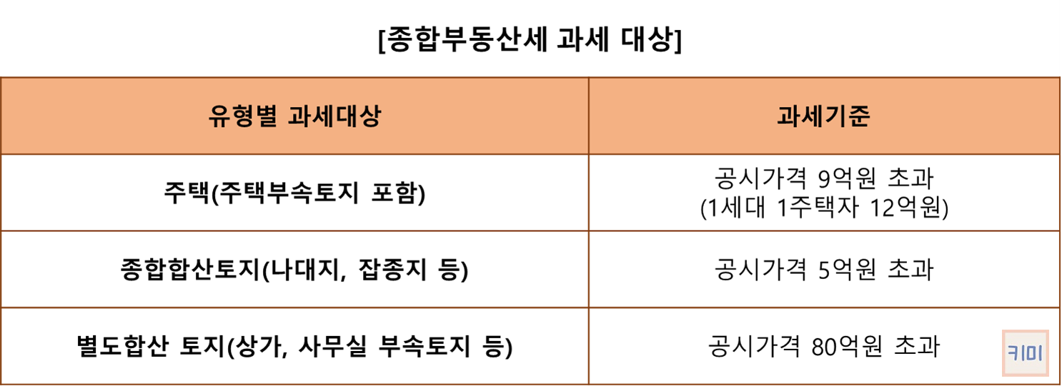 주택은 9억원, 나대지, 잡종지 등의 종합합산토지는 5억원, 상가, 사무실 등의 별도합산 토지는 80억원이 과세 기준입니다.