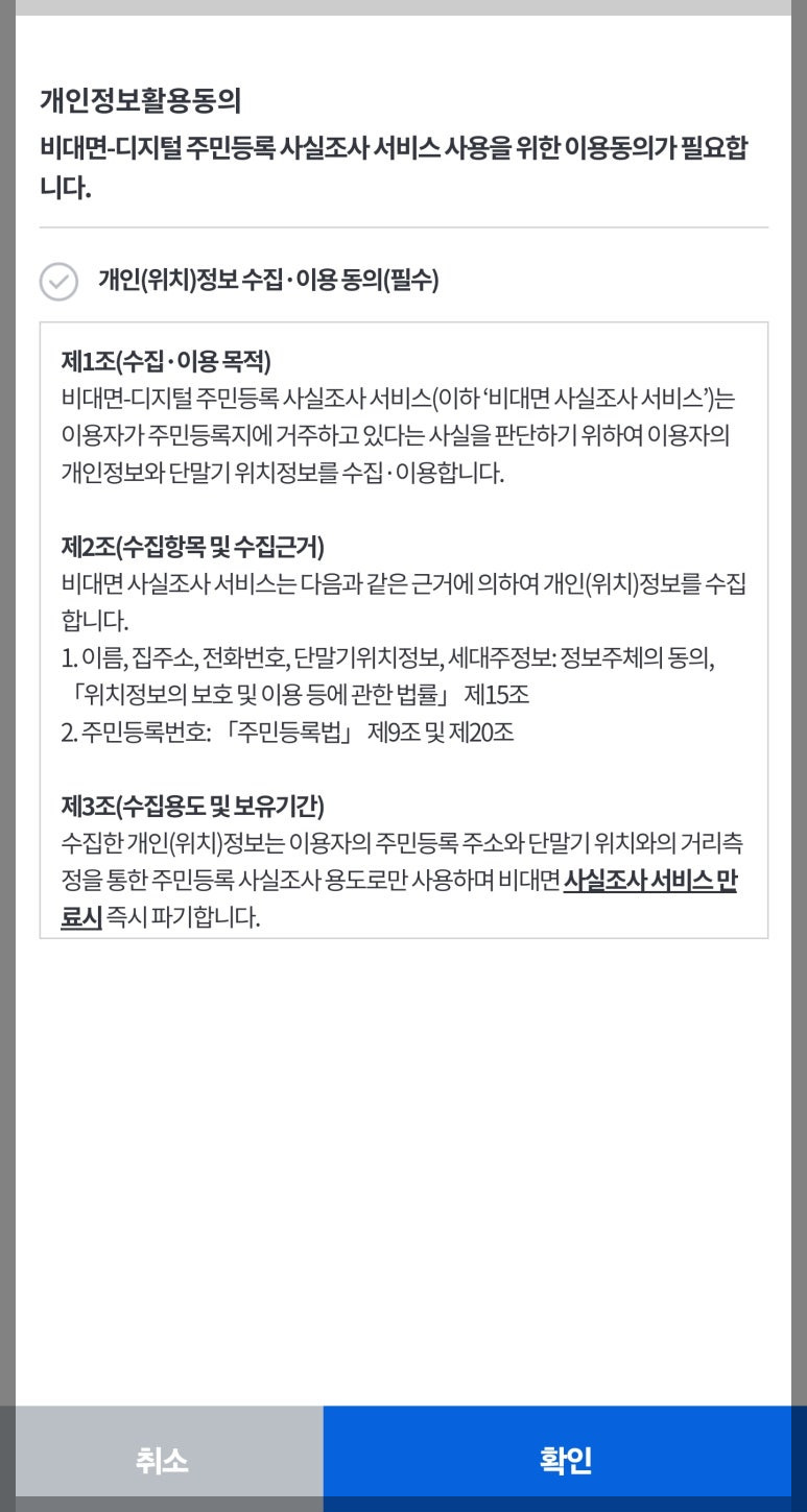 - [3단계] 세대정보 사실여부 확인 : 세대 주소지 정보와 휴대폰 GPS 위치정보가 일치하는지 확인합니다.