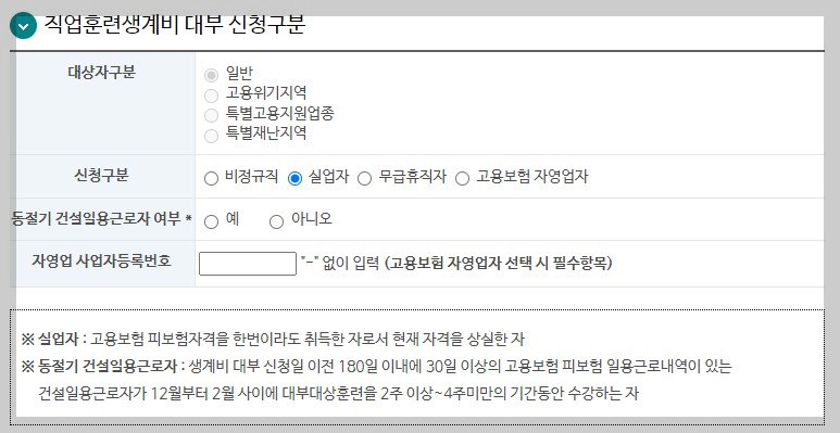 ⑥ 비정규직/실업자/무급휴직자/고용보험 자영업자 중 본인이 해당하는 신청자 신분 선택