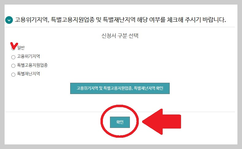 고용위기지역, 특별고용지원업종, 특별재난지역에 해당하지 않는 경우 일반을 선택하시면 됩니다.