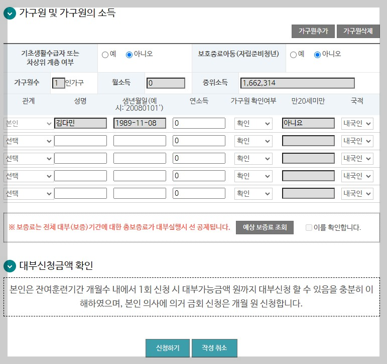 ⑩ 가구원 소득 입력 및 신청금액 확인