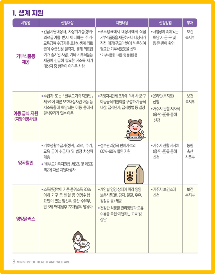 그 외에도 장애인, 유공자, 한부모가족, 청소년, 여성 가장, 실업자 등 별도의 지원기준이 있는 차상위계층을 위한 지원사업도 있습니다.