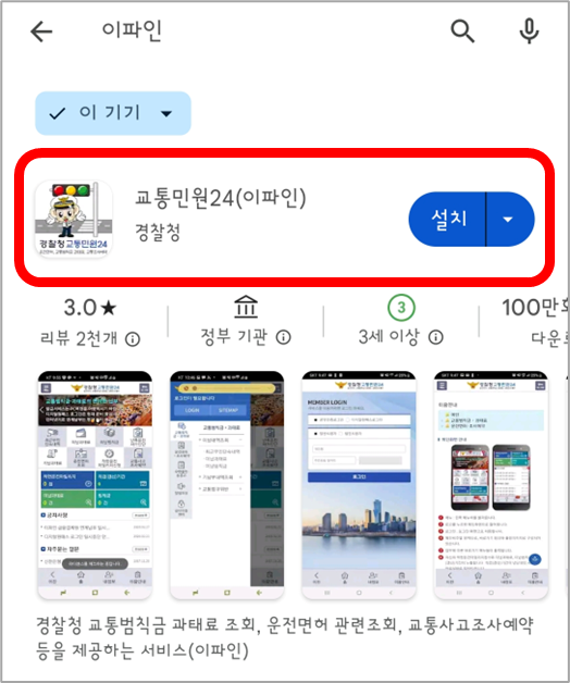 앱 스토어에서 '교통민원24' 또는 '이파인'을 검색해서 설치하시고,
