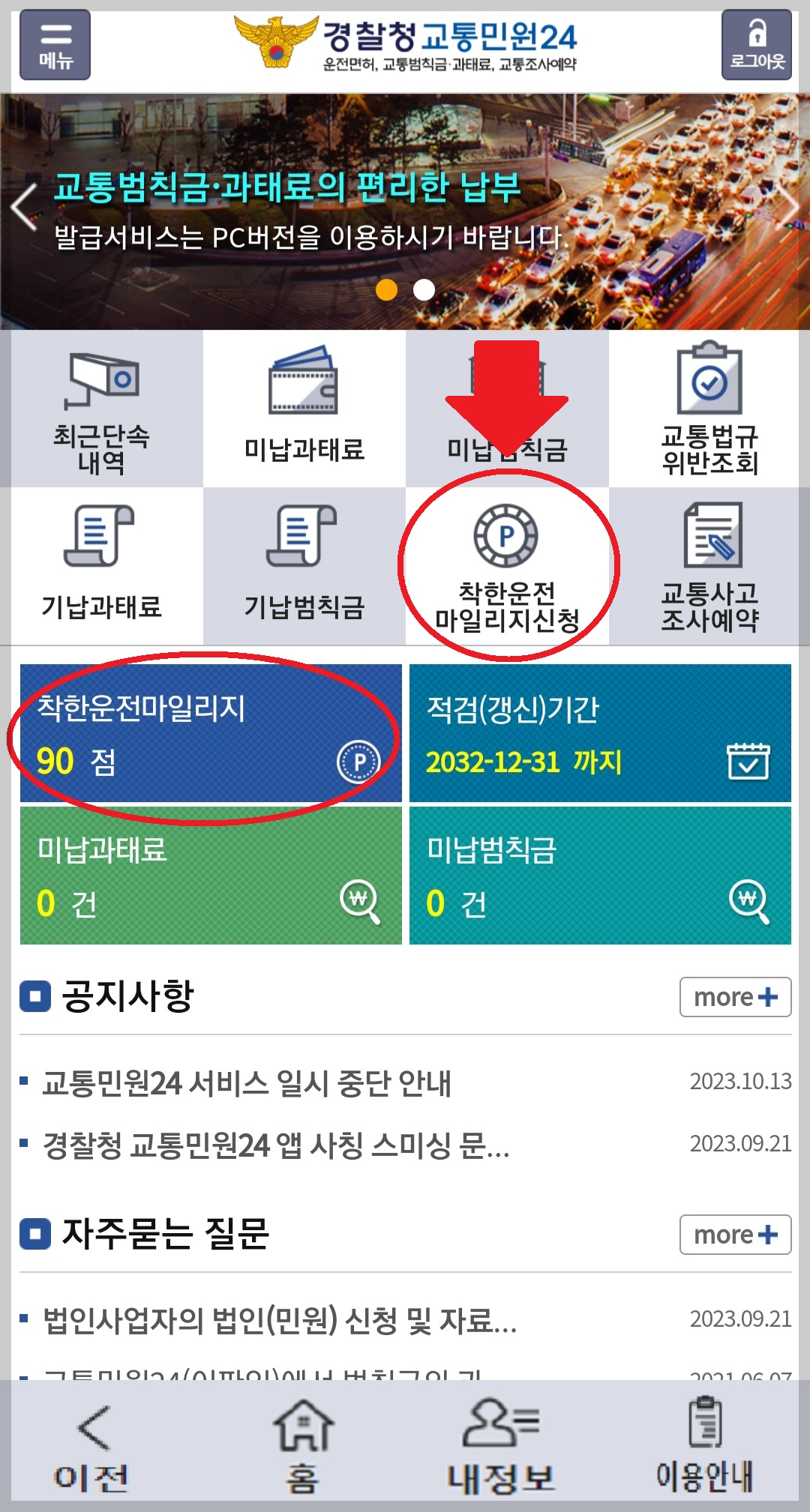 본인인증으로 로그인 한 뒤 메인 화면에 있는 착한운전 마일리지를 선택하여 신청하시면 됩니다.