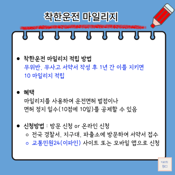 착한운전 마일리지는 운전면허를 보유한 운전자가 무위반, 무사고 서약서를 작성한 뒤 1년간 이를 지키면 10 마일리지가 적립됩니다.