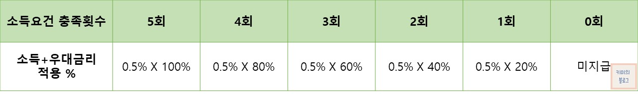신청 시점 및 가입 후 1년을 주기로 개인소득금액의 소득요건*을 심사하여, 충족 횟수에 따라 우대금리를 적용합니다.