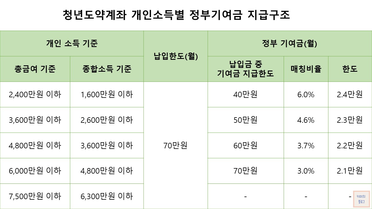• 정부 기여금 : 소득 수준에 따라 3.0%, 3.7%, 4.6%, 6.0%