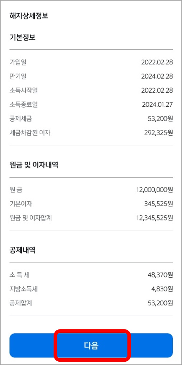 만기를 한 달 남기고 중도 해지하면 12,292,325원을 수령하게 됩니다. 만기 금액보다 86만원이나 적어진 금액입니다. 중도 해지를 원하시면 다음 버튼을 눌러 해지를 진행하시면 됩니다.