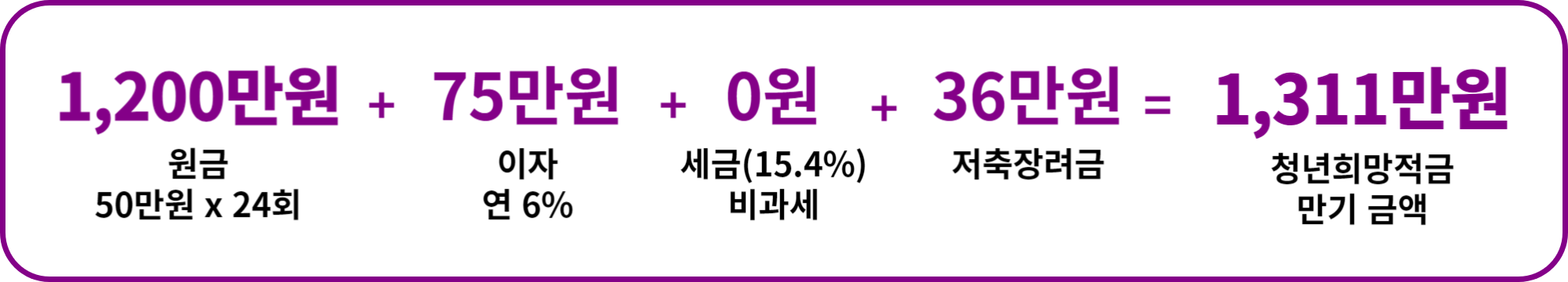 이를 종합하면 청년희망적금 만기 금액은 최대 1,311만원을 수령할 수 있습니다. (매달 납입액을 입금한 날짜에 따라 만기 금액은 달라질 수 있습니다.)
