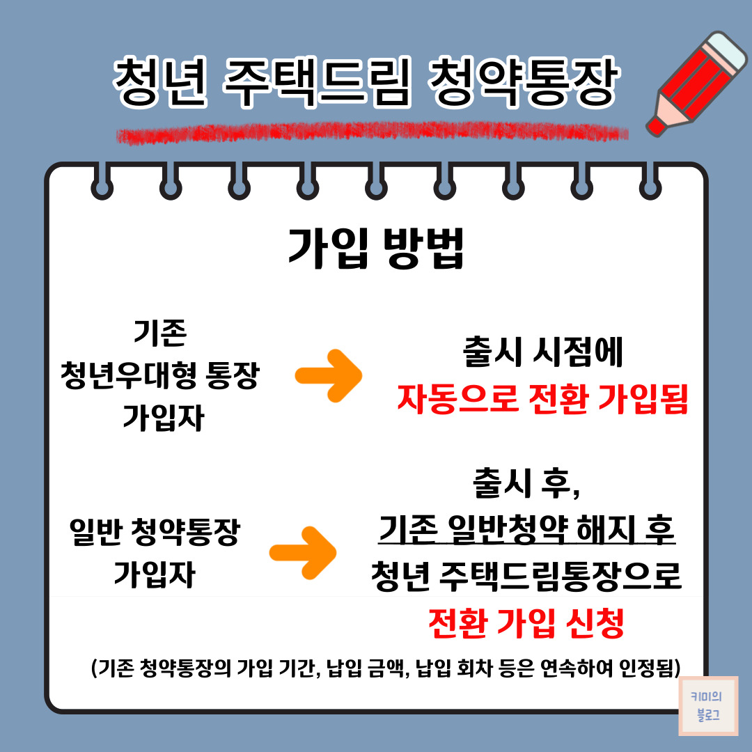 기존 청년우대형 주택청약종합저축 가입자는 청년 주택드림 통장의 가입자격 여부와 상관없이 출시 시점에 자동으로 전환가입 되므로, 신경 쓰지 않으셔도 됩니다.