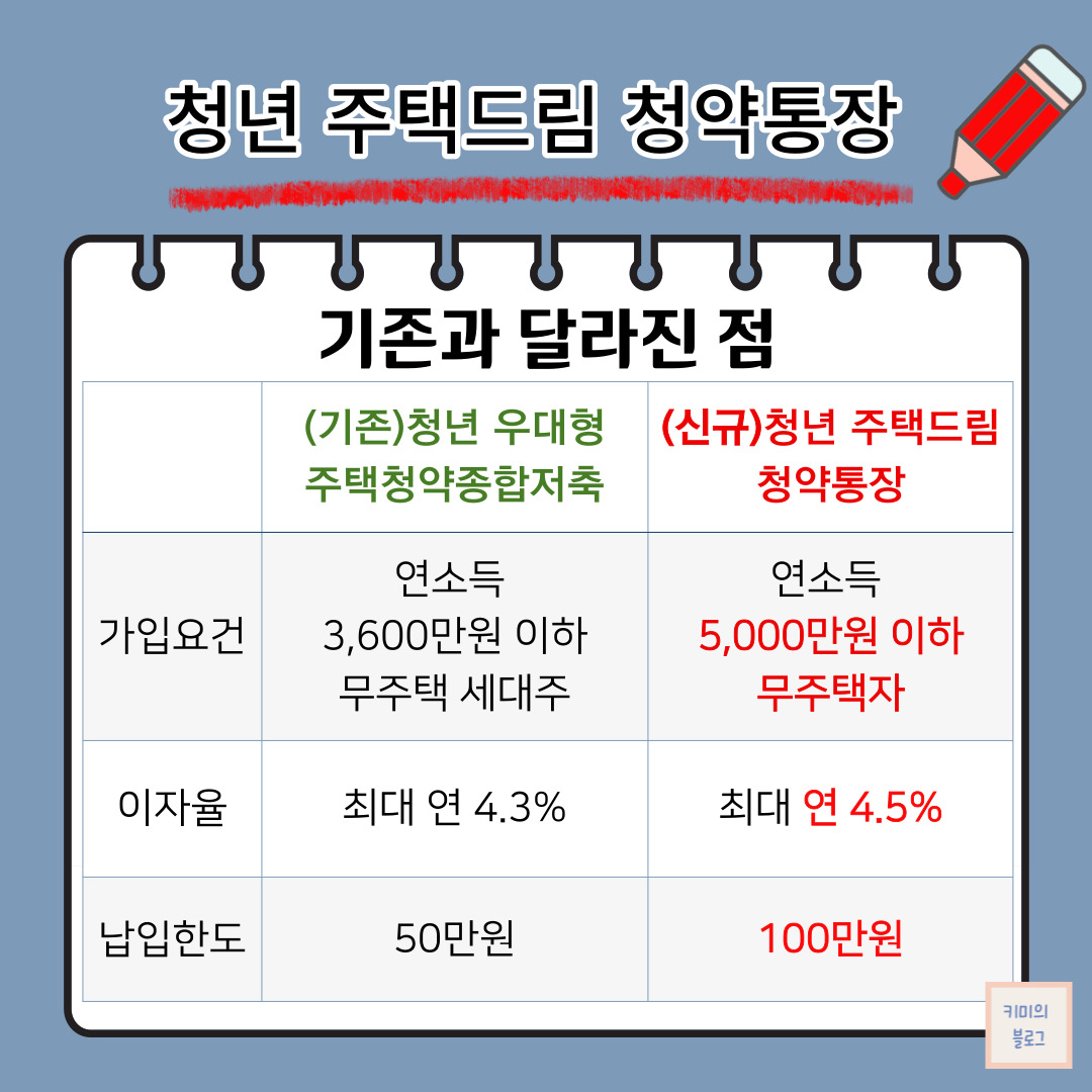 기존 청년 우대형 청약통장의 가입요건은 연 소득 3,600만 원 이하의 무주택 세대주였으나, 청년 주택드림 청약통장은 연 소득 5,000만 원의 무주택자로 조건이 완화되었습니다.
