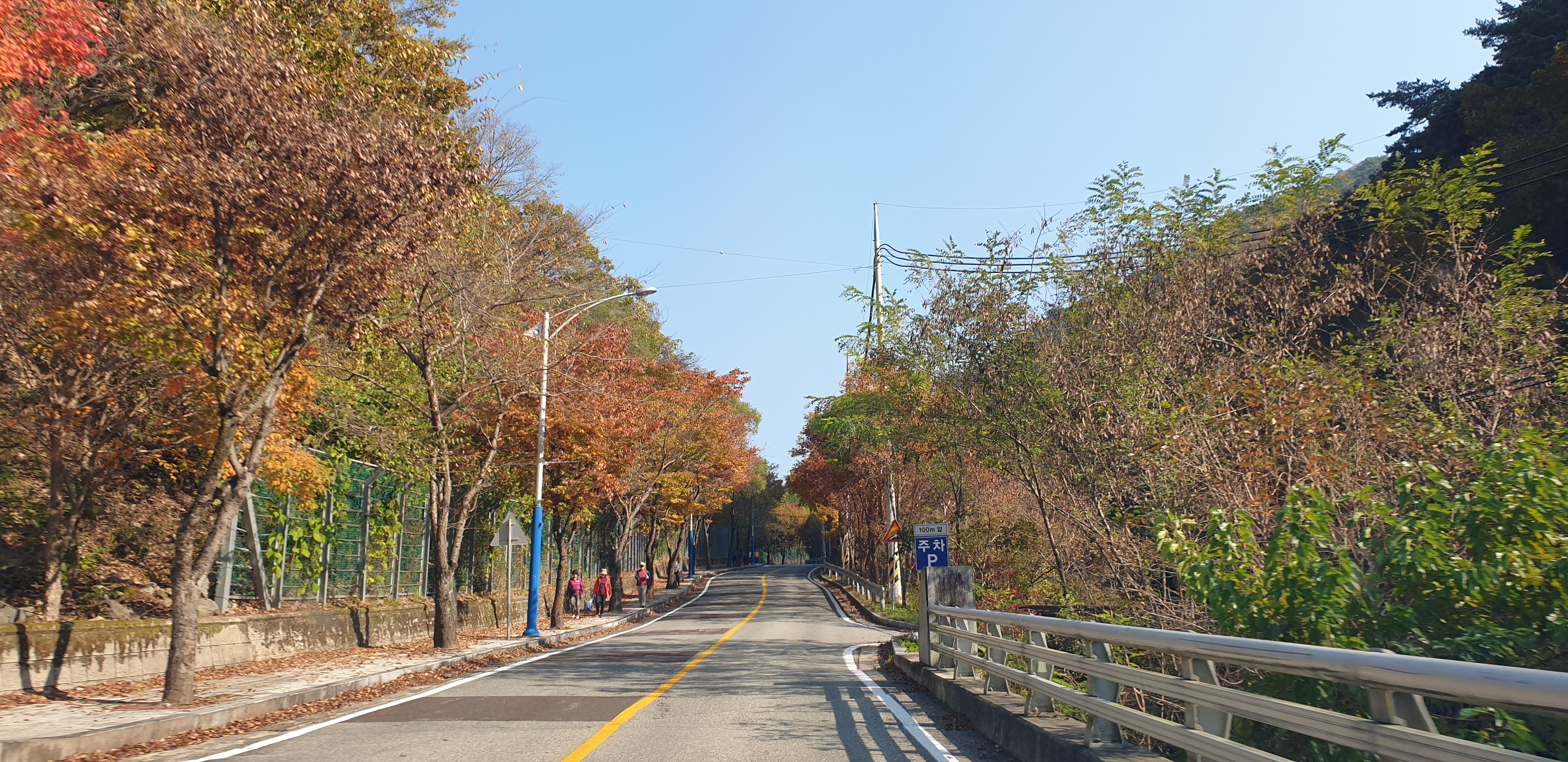 아래 사진은 청량산 도립공원 매표소를 지나 청량산자락을 올라가는 도로입니다. 도로 중간중간 주차장이 있고, 도로변에는 보도가 조성되어 있어서 가벼운 산책도 가능합니다.