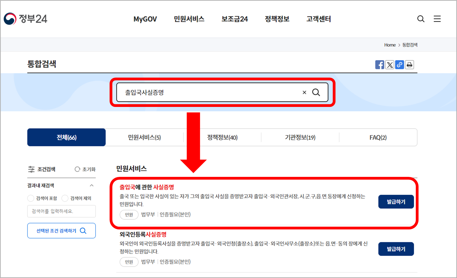 검색 결과 중 민원서비스 항목에 있는 '출입국에 관한 사실증명'을 선택합니다.