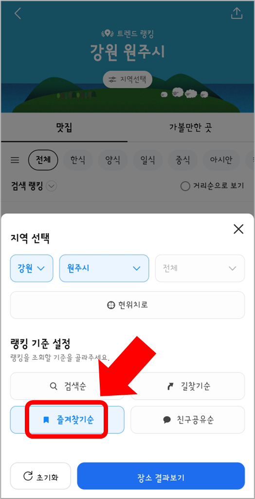 저는 주로 즐겨찾기순으로 맛집을 찾습니다.