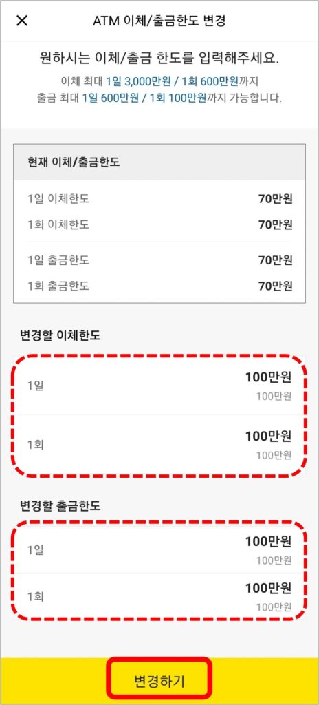 그리고 ATM에서 이체할 한도 또는 출금할 한도를 입력한 뒤 [변경하기]를 선택하면 변경이 완료됩니다.