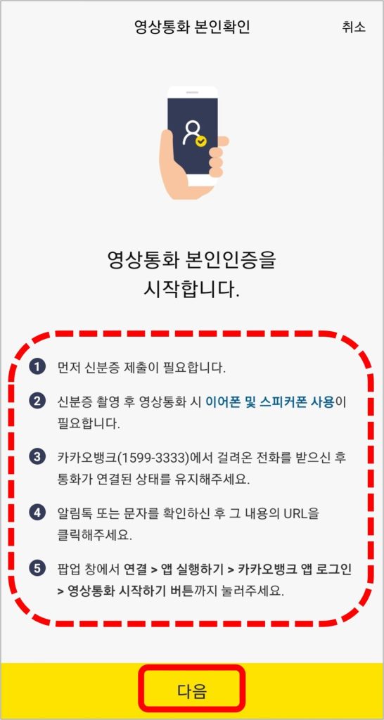 카카오뱅크 직원과의 영상통화로 본인인증을 진행하고, 이체한도가 한시적으로 늘어나게 됩니다.