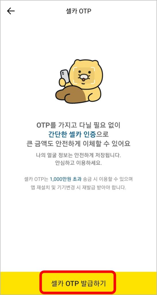 셀카 인증을 통해 셀카 OTP를 발급받으면 최대 이체한도가 1일 5억원, 1회 1억원까지 증액됩니다.