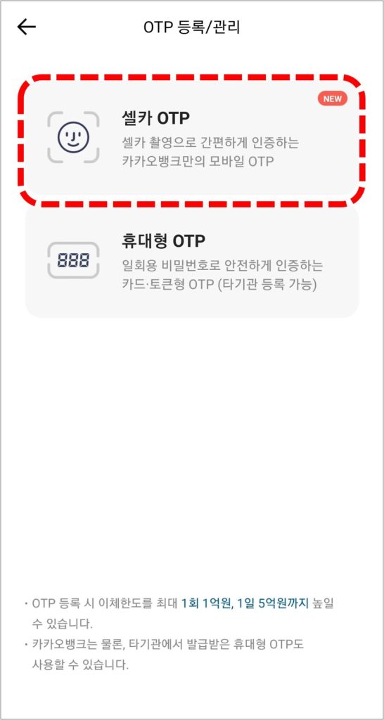 OTP는 셀카 OTP와 휴대형 OTP가 있는데, 별도로 OTP를 들고 다닐 필요가 없는 셀카 OTP 사용을 추천드립니다.