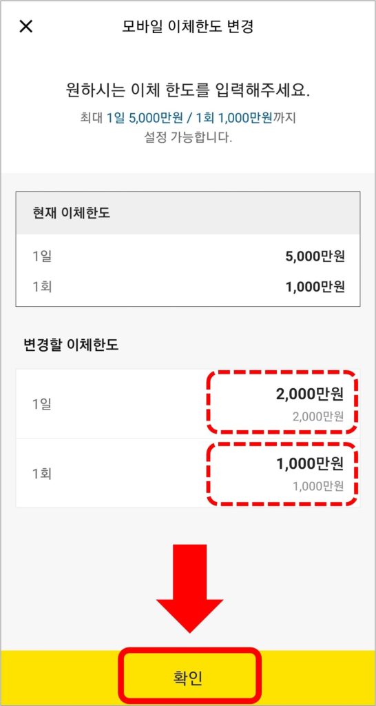 이체한도 변경을 선택하면 아래와 같은 화면에서 원하는 한도금액을 입력하고, [확인]을 선택하면 변경이 완료됩니다.