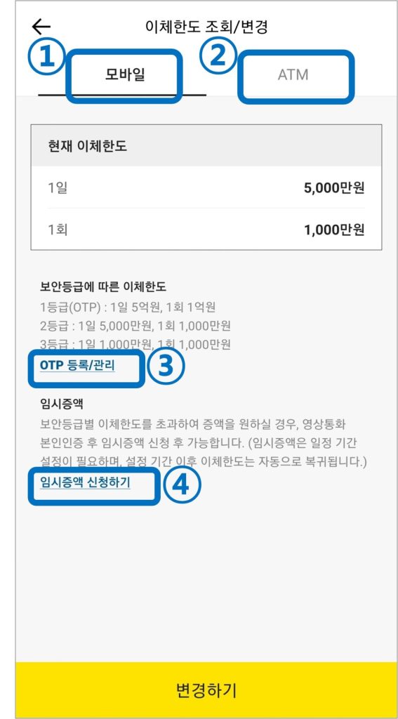 이번 글에서는 카카오뱅크 이체한도 및 ATM 출금한도를 변경하는 방법과, OTP 등록 없이 임시증액 신청하는 방법에 대해 소개해 드리겠습니다.