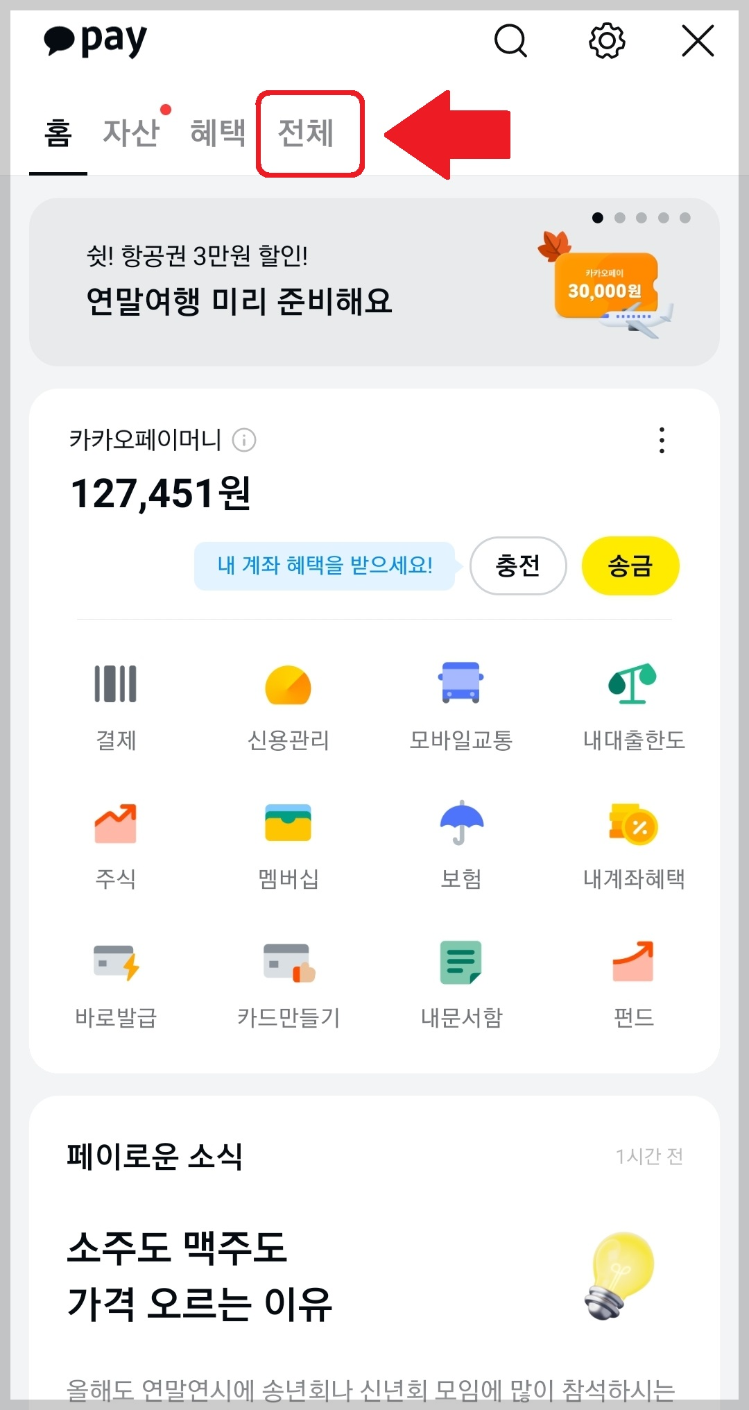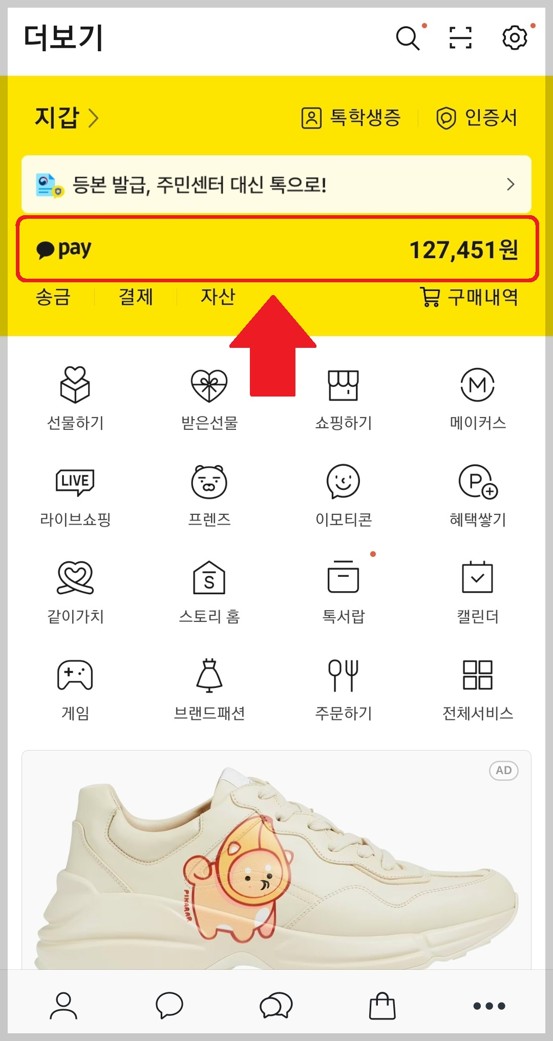 1. 카카오톡 어플의 카카오페이 페이지에 들어갑니다.