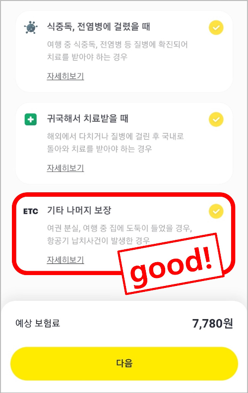 특별 담보사항 중에 여행 중 집에 도둑이 들었을 경우 보상해주는 항목이 마음에 들었거든요.