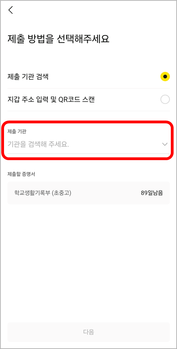 제출을 원하시면 [제출하기]를 누르고, 제출기관을 검색해서 선택하여 제출하면 됩니다.