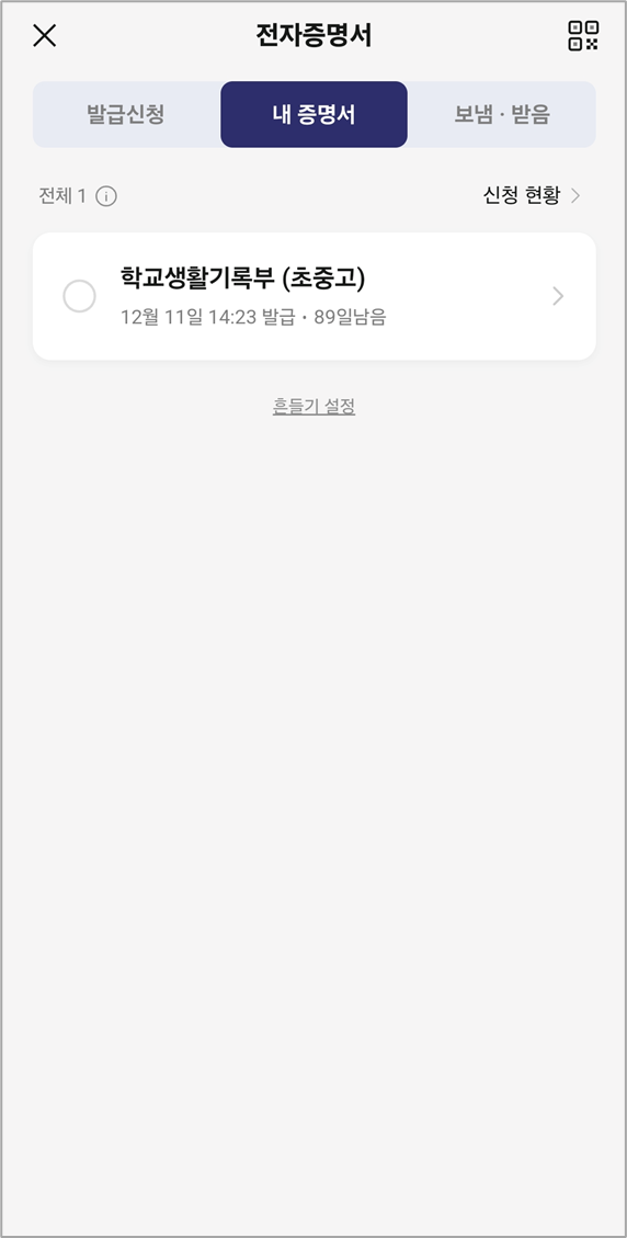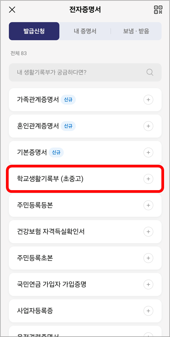 발급신청 가능한 전자증명서 목록 중에서 [학교생활기록부(초중고)]를 선택한 뒤,