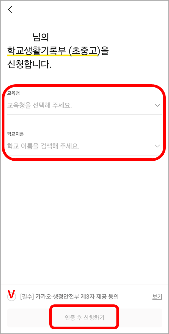 초/중/고 학교의 [관할 교육청]과 [학교이름]을 입력하고, 정보제공에 동의 후, [인증 후 신청하기]를 누릅니다.