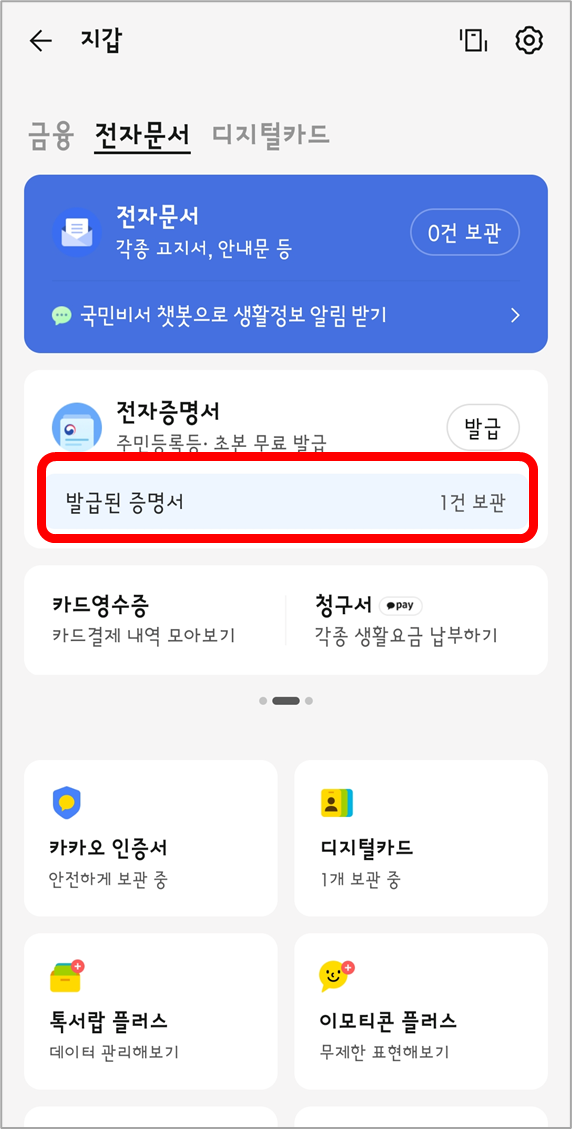 [카카오톡 지갑] → [발급된 증명서]에서 언제든지 다시 조회하거나 저장 및 제출할 수 있습니다.