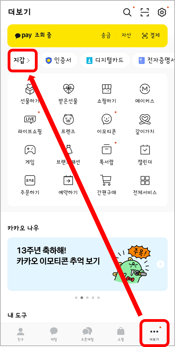 먼저, 카카오톡 [더보기]에서 [지갑]을 선택합니다.