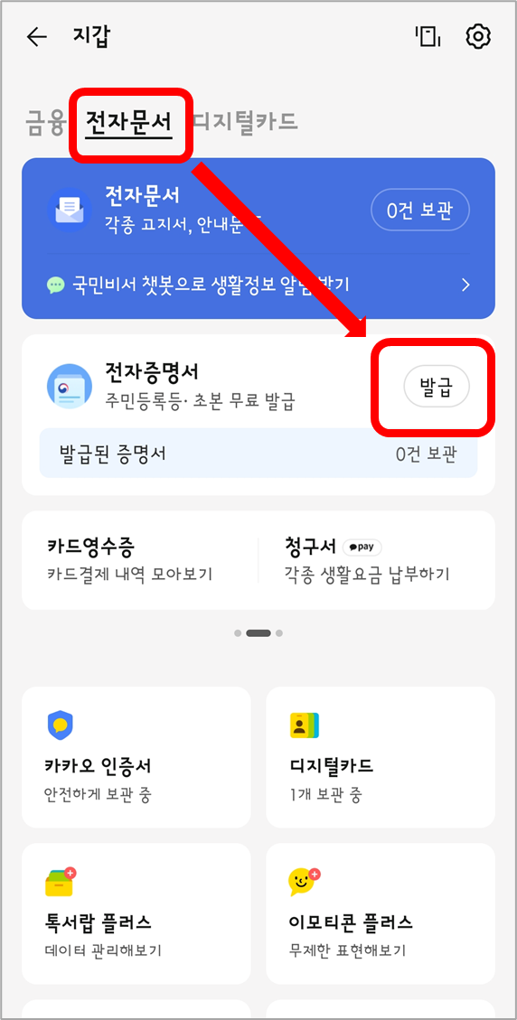 [카카오톡 지갑] → [발급된 증명서]에서 언제든지 다시 조회하거나 저장 및 제출할 수 있습니다.