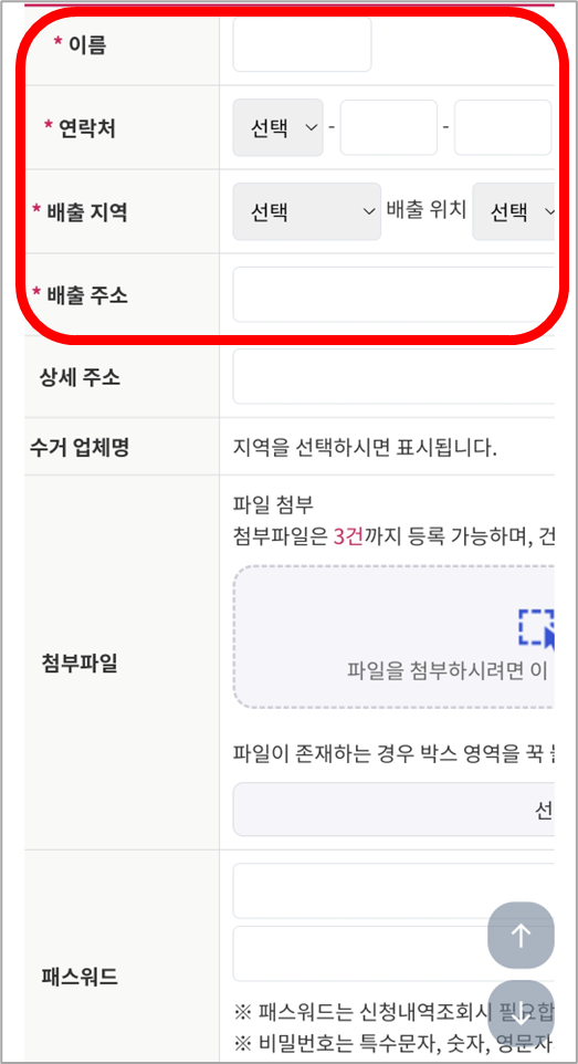먼저, 신청페이지에서 이름, 연락처, 배출 지역, 주소를 입력합니다. 첨부파일은 없어도 됩니다.