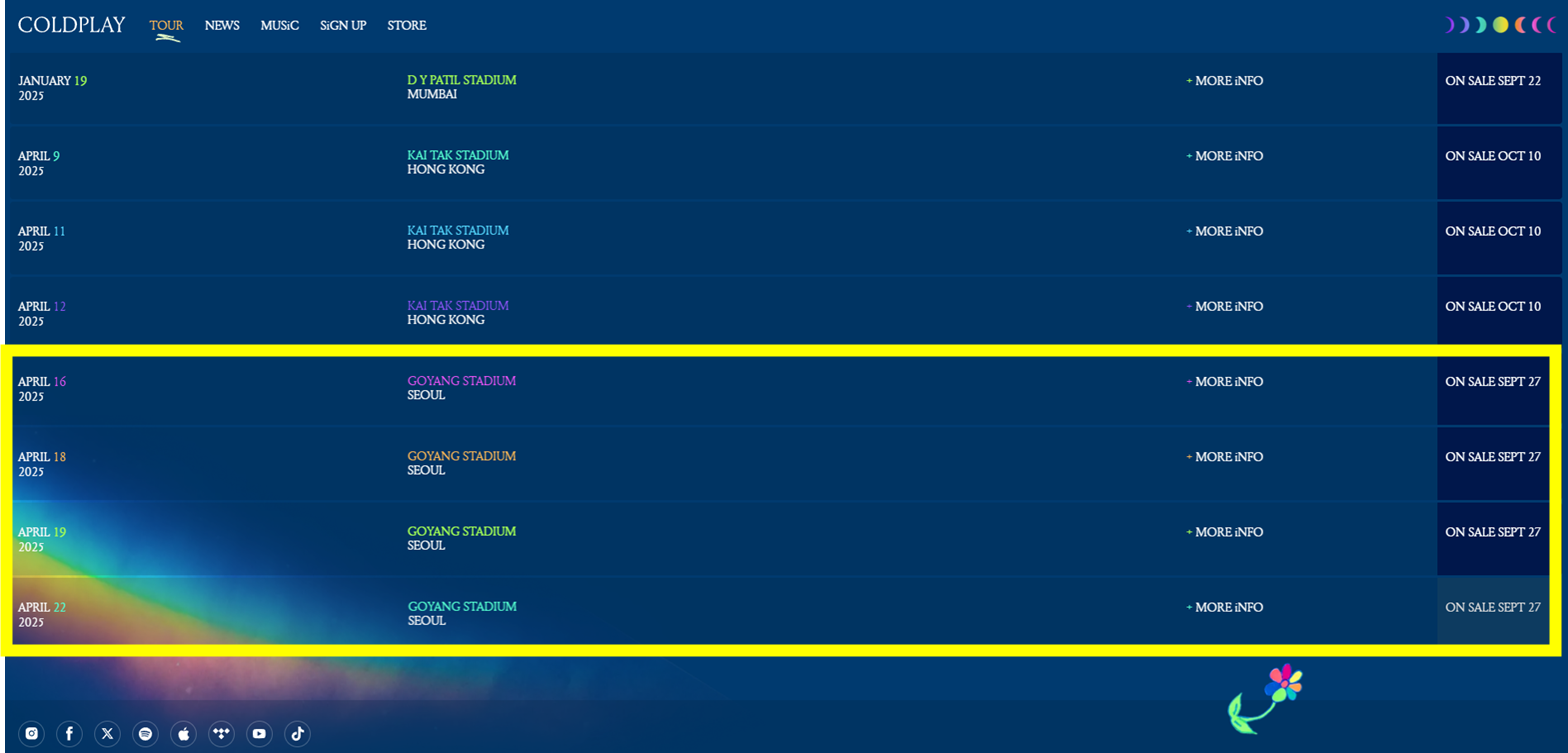 콜드플레이 공식홈페이지에 가면 아래와 같이 서울 공연 일정을 확인할 수 있습니다. 공식홈페이지에 미리 가입해 두셔야 선예매가 가능합니다.