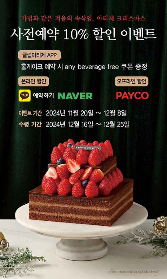 아티제에서는 9가지 크리스마스 케이크의 사전예약 10% 할인 이벤트를 진행하고 있습니다.