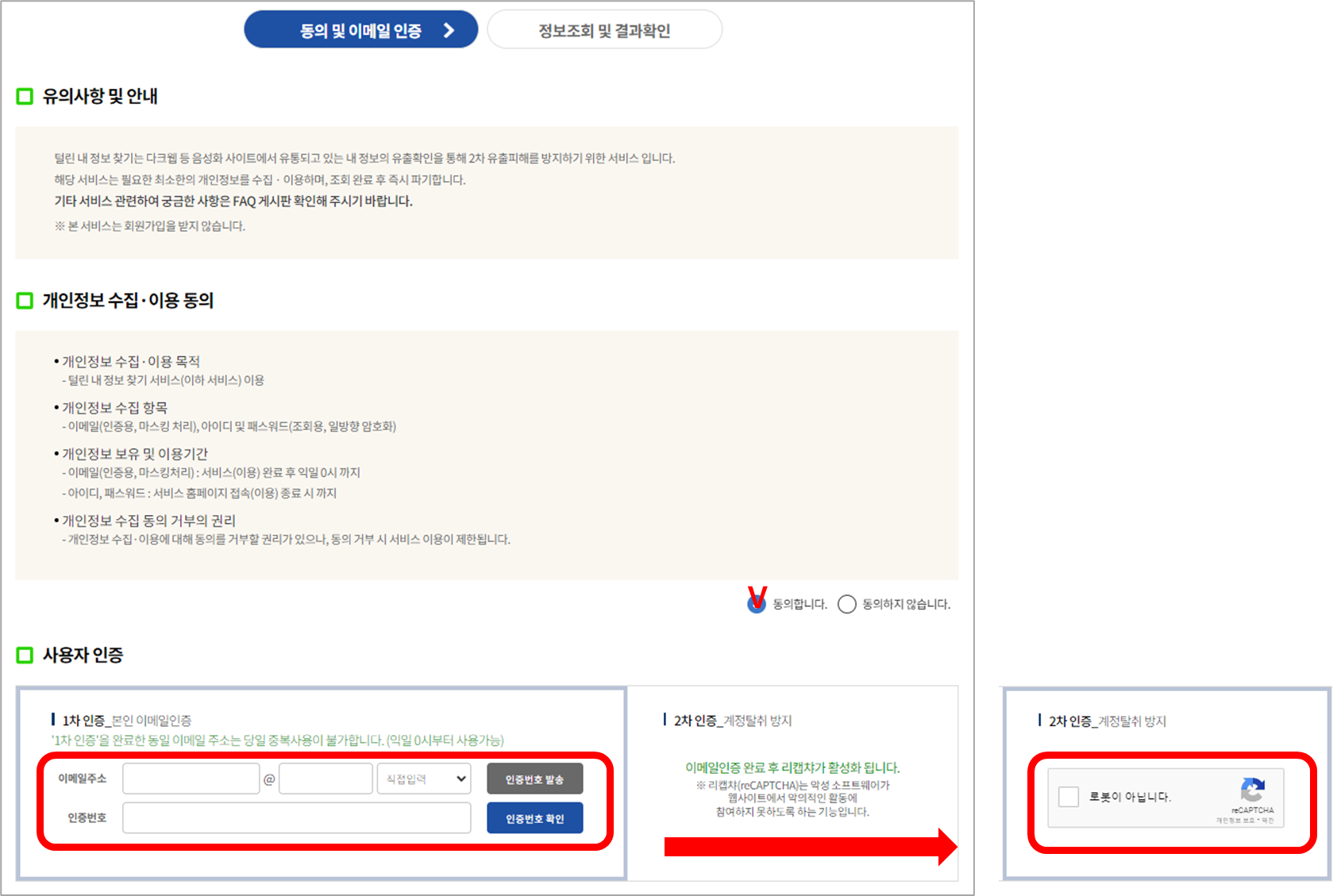개인정보 수집에 동의하고 이메일 인증을 진행합니다. 이메일 인증 후 오른쪽에 나타나는 '로봇이 아닙니다'를 확인하시면 됩니다.