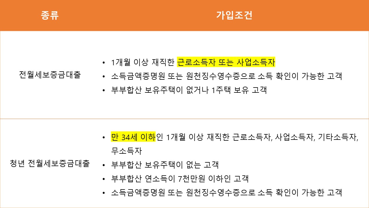 토스 전월세보증금대출은 신청 고객에 따라 크게 2가지 종류로 나뉩니다. 일반 전월세보증금대출과 청년 전월세보증금대출의 가입 조건은 다음과 같습니다.