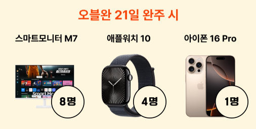 그리고 오블완 챌린지 21일을 모두 참여하면 스마트모니터, 애플워치, 아이폰 16 프로 등 고가의 선물을 받을 기회가 생깁니다.