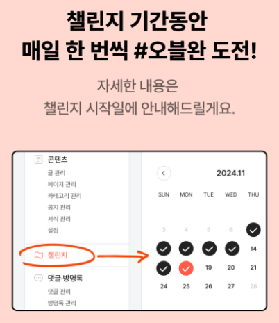 티스토리 블로그의 오블완 챌린지는 11월 7일부터 27일까지 21일간 진행됩니다.