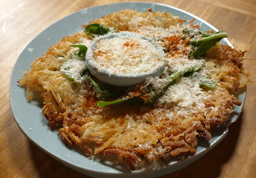 새우감자전은 바삭바삭한 감자전 위에 루꼴라와 치즈, 수란을 얹은 메뉴입니다. 감자전만 잘라먹어도 굉장히 바삭하고 맛있는 감자전입니다. 하지만 여기에 루꼴라를 함께 집어서 수란을 찍어 먹으면 루꼴라의 향이 특별한 풍미를 더해줍니다.
