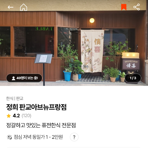 예쁘고 독특한 퓨전 한식으로 유명한 "정희"가 판교에도 생겼습니다. 정희는 원래 광주 동명동에서 유명한 맛집인데 최근에 수도권에도 하나 둘 매장이 생기고 있습니다.