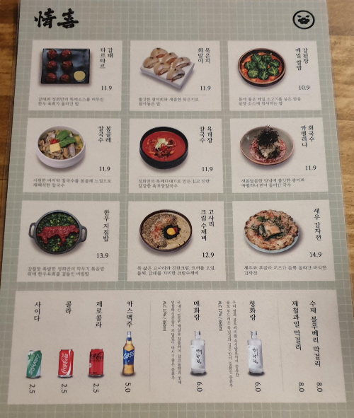 정희의 가장 큰 단점은... 음식 양이 적습니다. 가격은 1인분인데 양은 0.7인분 정도입니다. 2명이 가면 최소 3가지는 주문하시는 것이 좋습니다. 가격은 대부분 11,900원이지만 양이 꽤 적어서 저렴한 가격은 아니라고 생각됩니다.