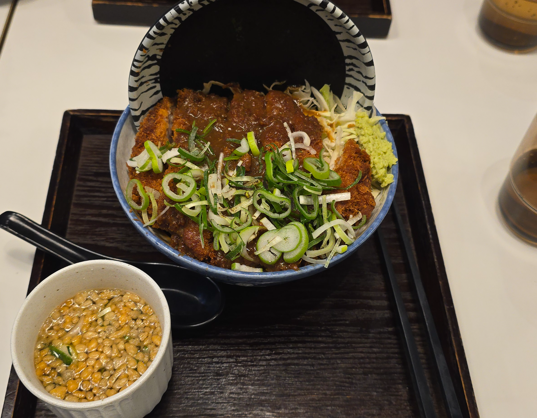 독특한 미소소스를 얹은 카츠동인데, 와사비가 곁들여 나와요.