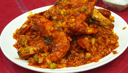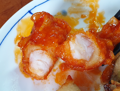 칠리새우와 칠리대하는 소스는 비슷하고 새우의 종류가 다릅니다. 칠리대하는 진짜 대하를 사용해서 한 마리가 거의 손바닥만 합니다. 칠리새우도 큰 새우를 사용해서 단면 사진을 보시면 통통한 새우살을 보실 수 있습니다.