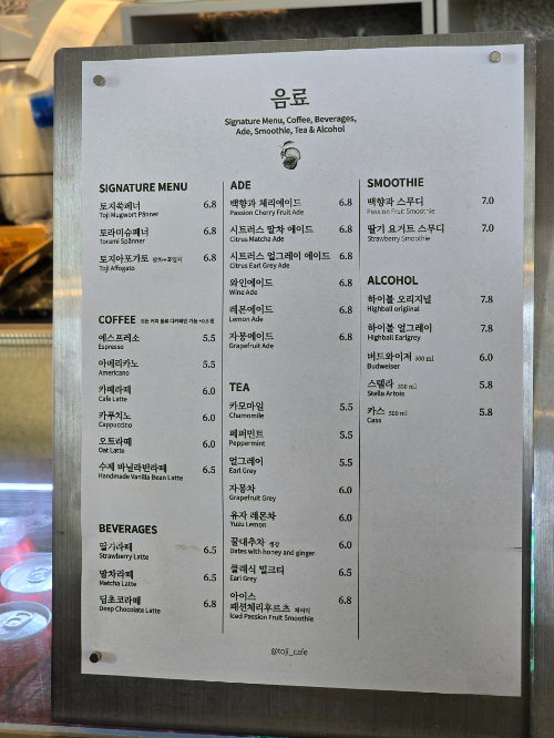 평택 토지 카페의 음료 메뉴입니다. 시그니처 음료, 커피, 에이드, 차, 스무디에 주류도 있습니다.
