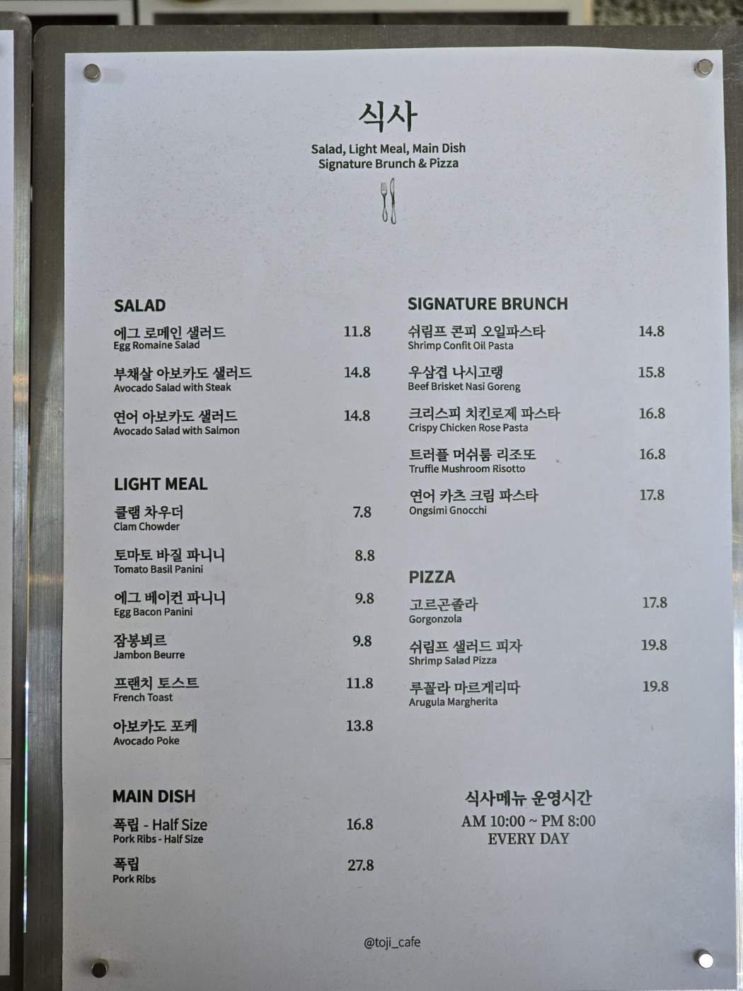 토지는 브런치&베이커리 카페이기 때문에 식사 메뉴가 꽤 다양하게 있습니다. 다른 손님들을 보니 브런치 메뉴를 드시는 분이 많았습니다.