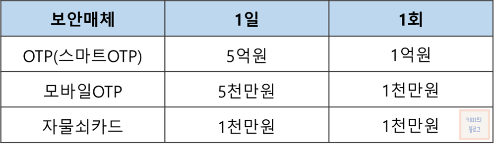 - OTP(스마트OTP) : 1일 5억원, 1회 1억원