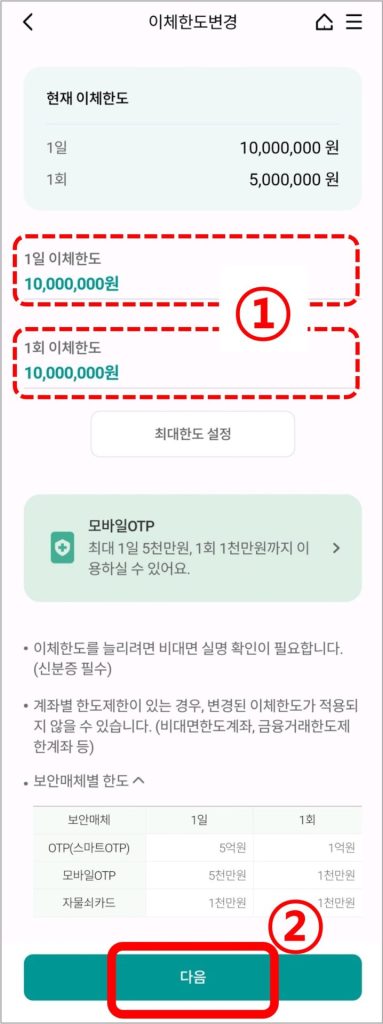 - 모바일 OTP : 1일 5천만원, 1회 1천만원