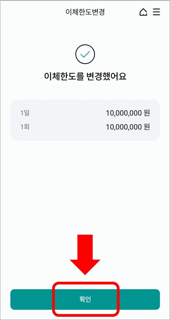 본인의 최대한도 내에서 이체한도를 변경하는 것은 간단합니다. 원하는 이체한도를 입력 후 [다음] → [한도변경]을 선택하시면 됩니다.